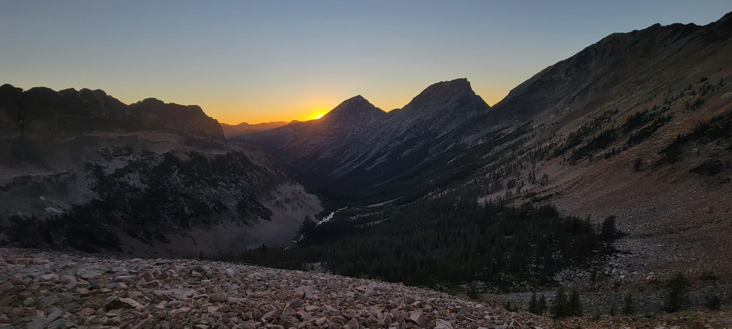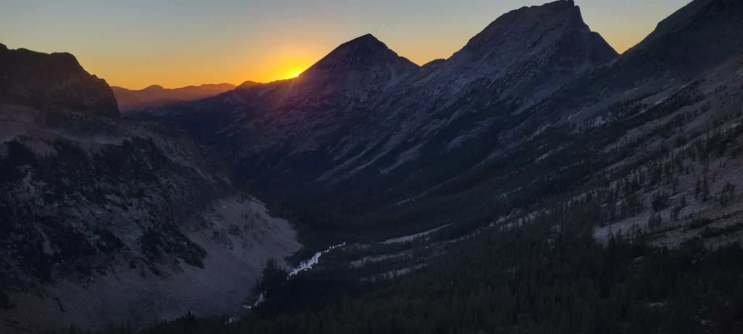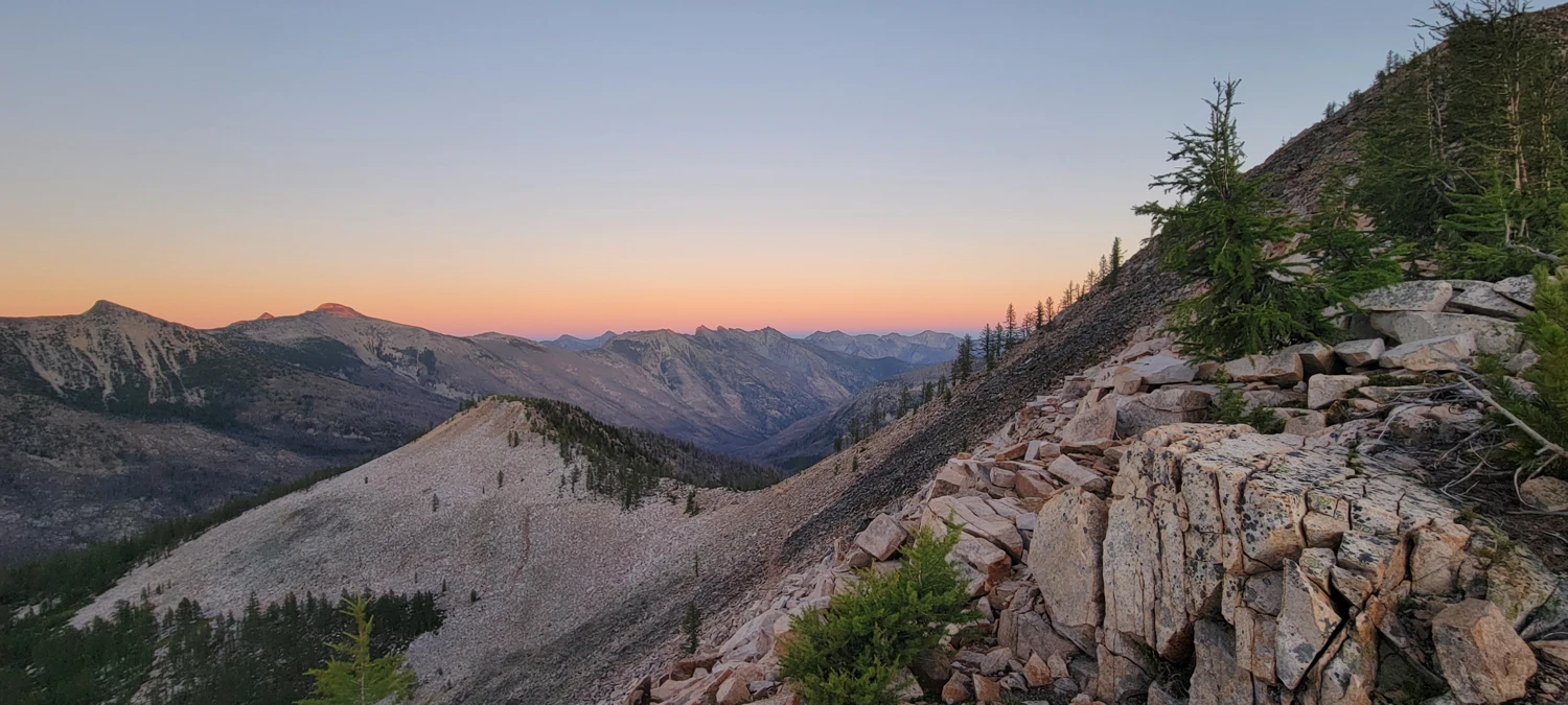 I had hoped for water at a small seasonal tarn near the pass, but wisely filled up in Eureka Creek. The tarn wasn’t there this year, so my stash of water was just enough for dinner and about ¾ of a liter to carry up Black Cap Mountain the next day. I set up a bivy just below the pass, had dinner, and watched the sunset while staring up at the climb ahead.