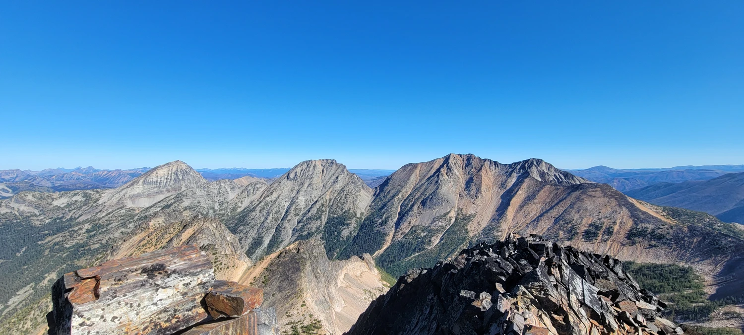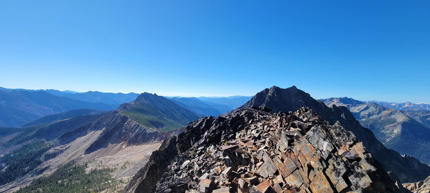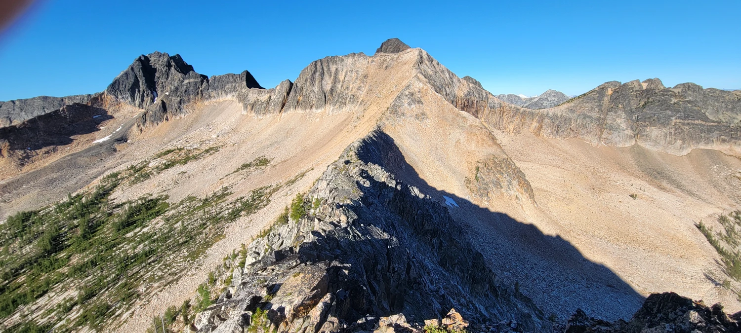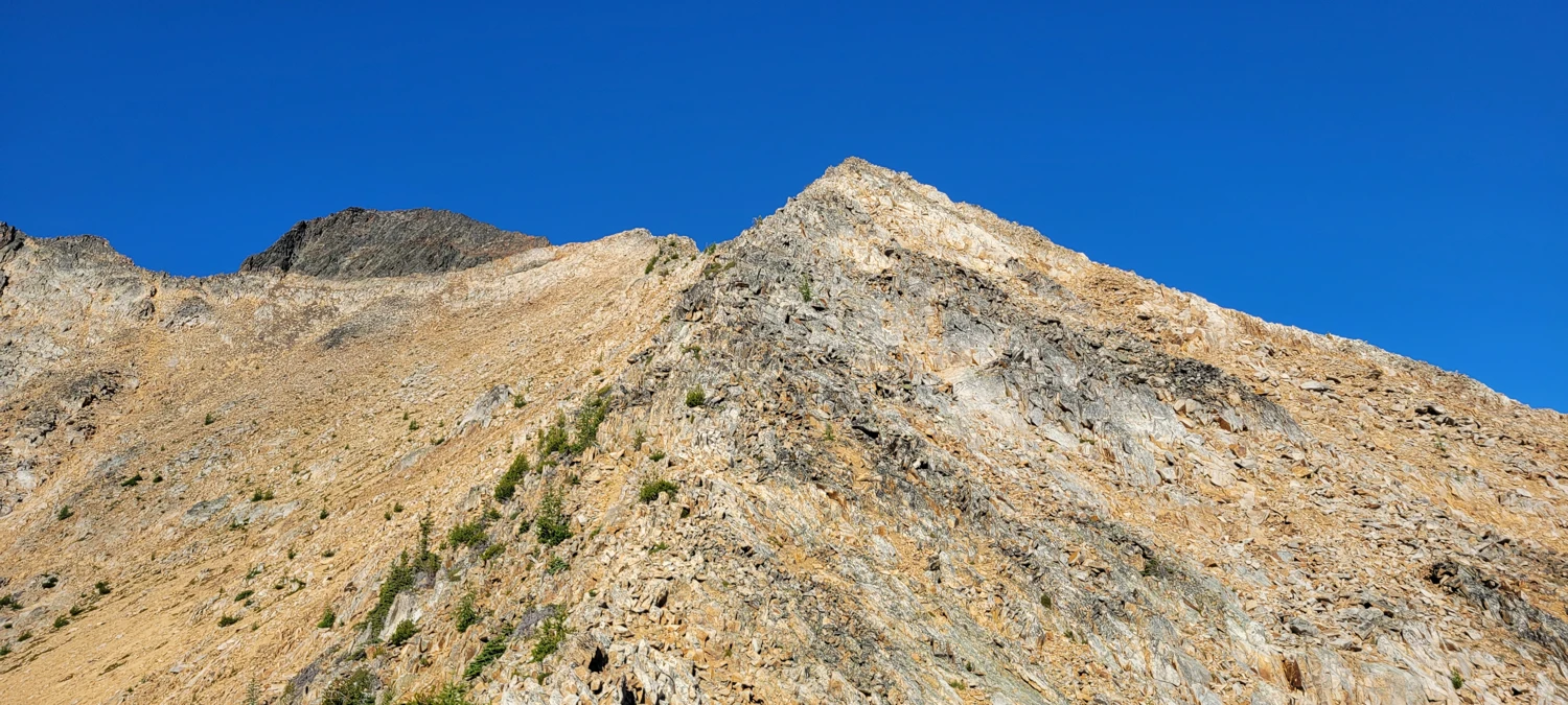 The next morning, I woke early around 6 a.m., ate a small breakfast, and began the climb. Initially, I tried traversing along the west side of the ridge, but the awful rock and steep slope made travel difficult. Moving up to the ridge proper was much easier—about 2–3 meters wide and easy to walk along. From below, the ridge looks intimidating, but the majority of the climb turned out to be a class 2 scramble with maybe one or two class 3 moves.
